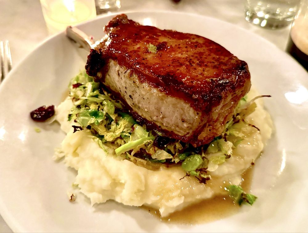 Heritage pork chop, mashed potato, Brussels, cranberry, pan sauce
