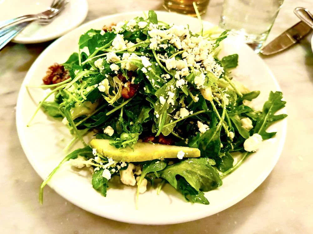 arugula, frisée, pear, honey walnuts, gorgonzola